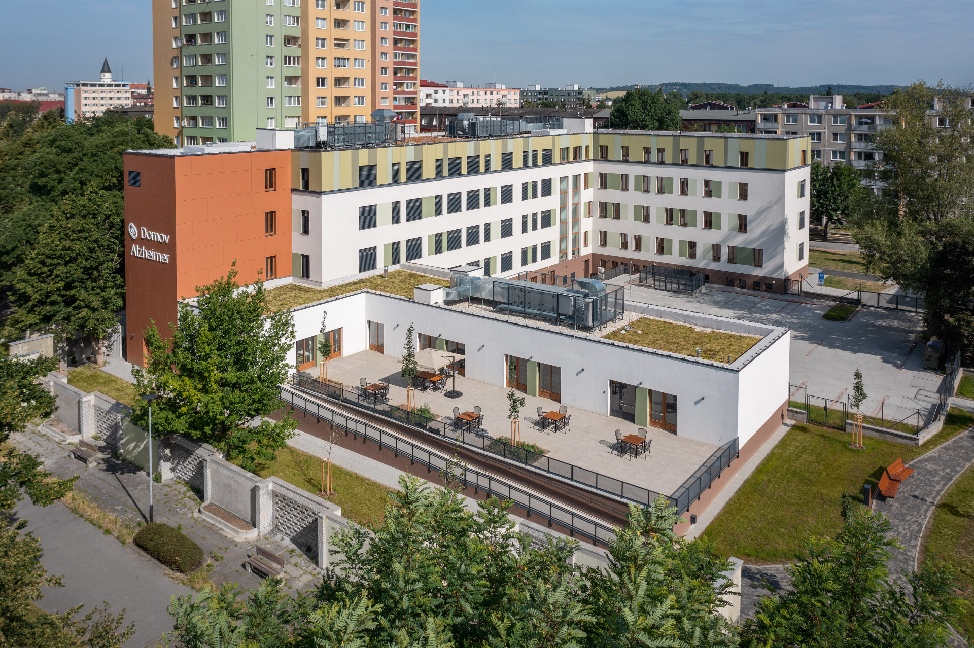 Záměrem investora bylo budovu přestavět pro potřeby sociální a zdravotní, kde hlavním účelem objektu Domova Alzheimer bude ubytovaní klientů se zabezpečením zdravotní péče a pobyt v tomto objektu včetně stravování a odpočinku v klidových zónách objektu uvnitř i vně. Ve třech podlažích (4. NP, 3. NP a 2. NP) jsou patra zaměřena pouze na ubytování klientů a jejich každodenní pobyt. V 1. NP je umístěno zázemí vedení domova – kanceláře, jídelna s terasou, recepce s kavárnou a hlavní vstup do objektu. V podzemním patře 1. PP je situován zejména gastro provoz, prádelna, šatny pro zaměstnance a technické zázemí objektu.