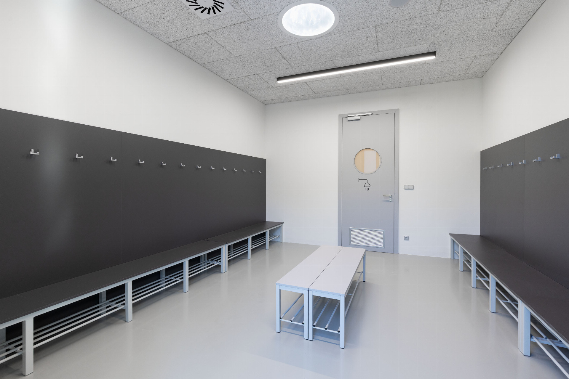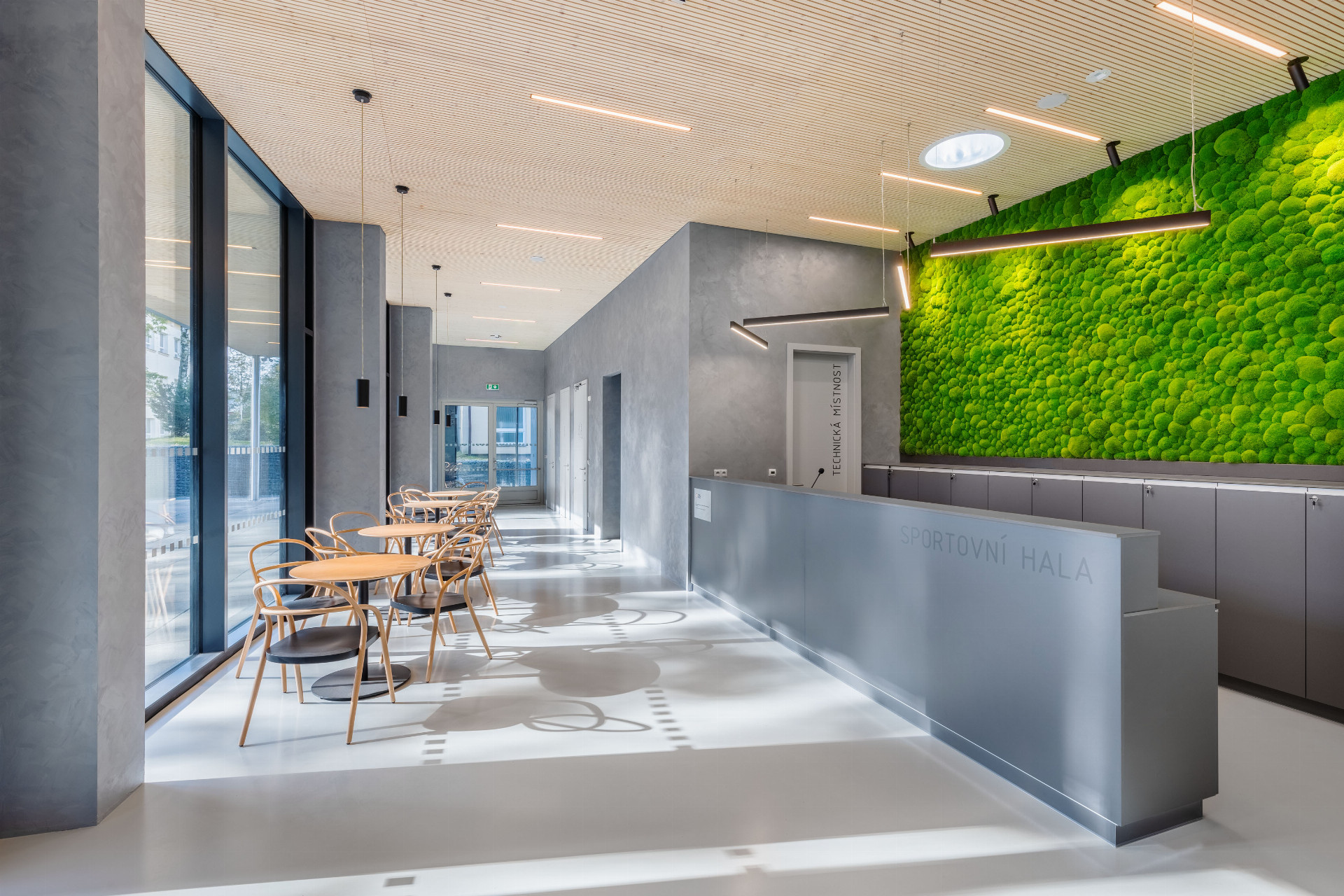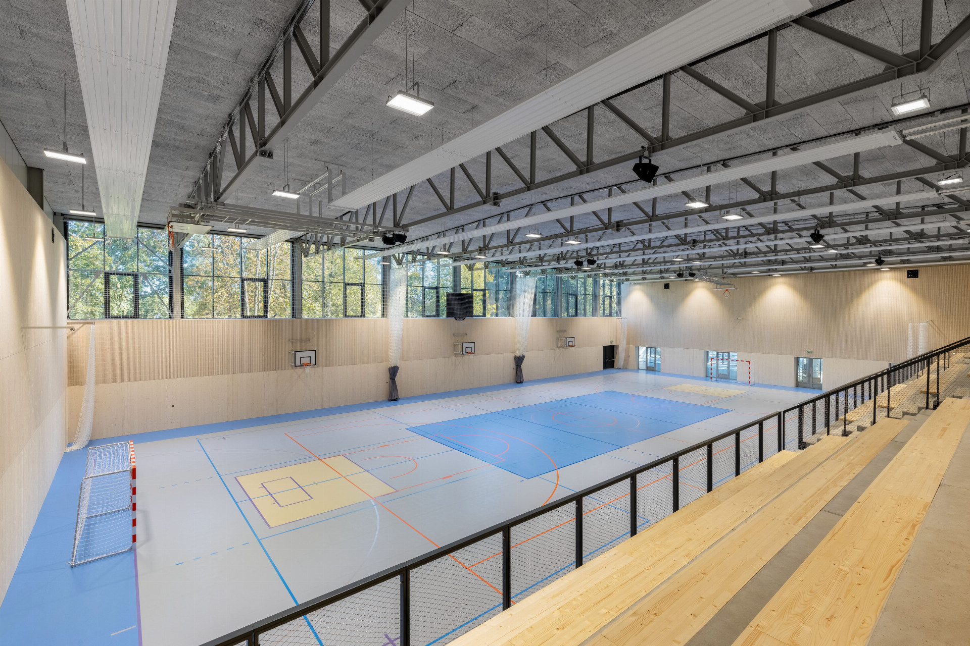 Sportovní hala o výšce 11,8 m a rozměrech 58,9 x 41,2 m nabízí hlavní hrací plochu 40 x 20 m s tribunou pro 300 diváků, menší sportovní sál a zázemí. Opláštění je provedeno systémovými PUR panely s požární odolností a speciální exteriérovou povrchovou úpravou v perleťové bílé barvě, odrážející okolní zeleň. Hala je vybavena certifikovanou sportovní podlahou, kombinovaným osvětlením a sportovním vybavením pro různé hry, jako volejbal, florbal či basketbal.